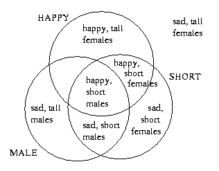 Here is an example of a Venn diagram with three properties: male/female, happy/sad, and short/tall. Some of the combinations, such as sad, tall males and happy, short females are labeled.
